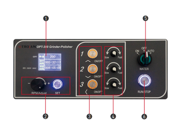 Шлифовальный диск легко заменить благодаря быстрой сборке и разборке поворотного рычага. Двигатель оснащен бесступенчатой регулировкой скорости, а текущее значение отображается на цифровом экране. Увеличенный срок службы обеспечивается использованием радиально-упорных подшипников вместо шариковых. Функция таймера позволяет точно контролировать время работы в диапазоне от 0 до 999 часов. Система охлаждения обеспечивает возможность длительной работы на низких оборотах. Управление осуществляется через простой ЖК-экран с диагональю 2,4 дюйма.
